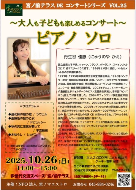曲目は、 ◾️道化師の朝の歌 /ラヴェル ◾️亜麻色の髪の乙女 /ドビュッシー ◾️秋の光に落葉が舞って /平吉毅州 ◾️木枯らし /ショパン ほか