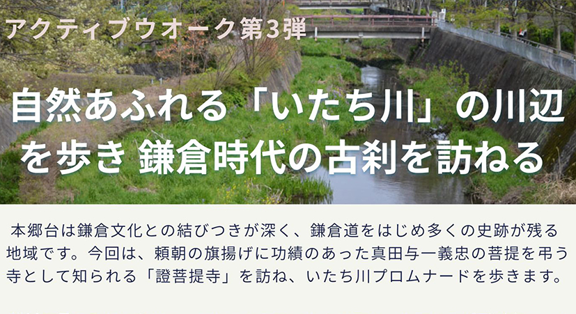 本郷台は鎌倉文化との結びつきが深く、鎌倉道をはじめ多くの史跡が残る地域です。今回は、頼朝の旗揚げに功績のあった真田与一義忠の菩提を弔う寺として知られる「證菩提寺」を訪ね、いたち川プロムナードを歩きます。